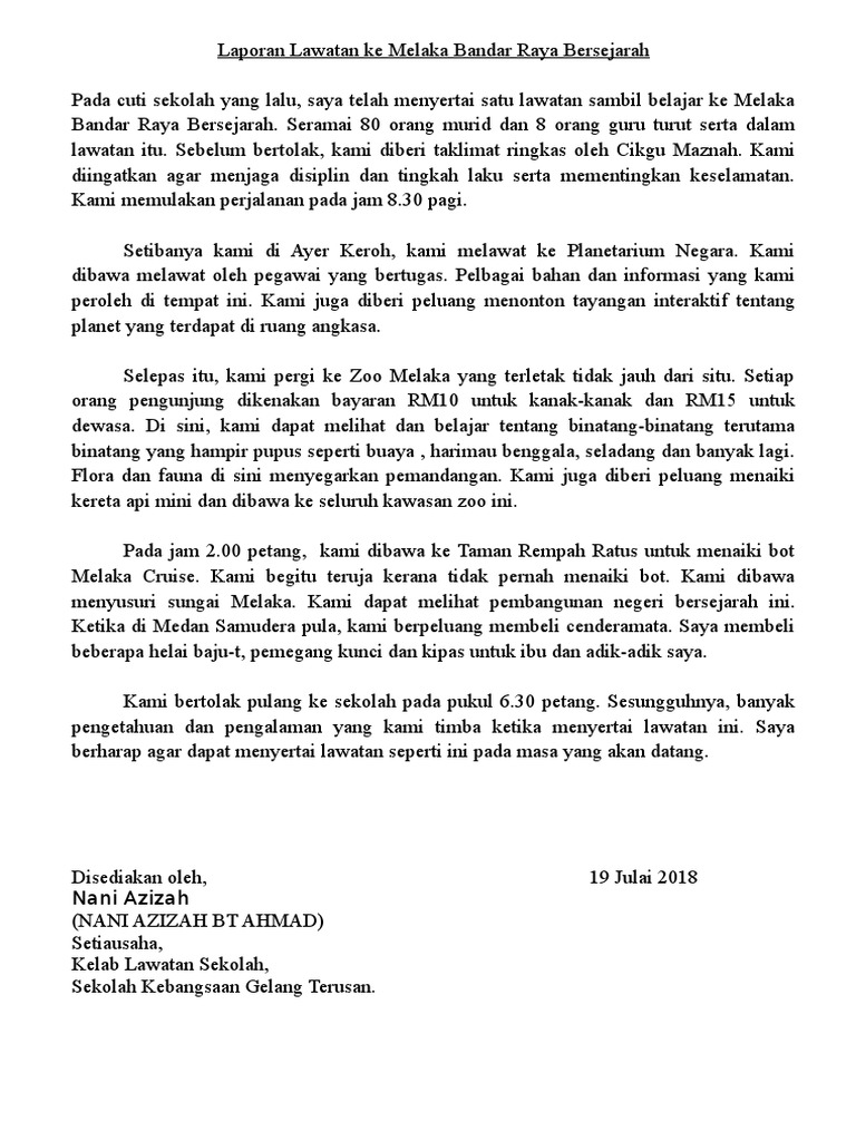 Melawat Ke Melaka Bandaraya Bersejarah Pada cuti semester yang lalu aku bersama keluargaku pergi bercuti di Melaka. Contoh surat kiriman tidak rasmi lawatan ke zoo negara have an image from the other contoh surat kiriman tidak rasmi lawatan ke zoo negara in addition it will include a picture of a sort that might be seen in the gallery of contoh surat kiriman tidak rasmi lawatan ke zoo negara. Rombongan ini telah disertai oleh 25 orang murid dan diiringi oleh 2 orang guru penasihat Puan Suriati dan Puan Mona.