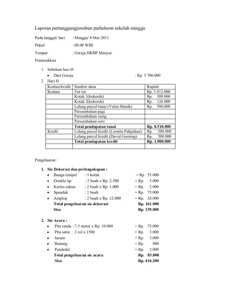 Pencatatan dan pengelolaan dana yang baik menjadi kegiatan yang penting sebagai wujud pertanggungjawaban sekolah minggu terhadap gereja dan yang terutama kepada Tuhan. Perayaan Natal tidak harus di lakukan pada tanggal 25 Desember karena Natal yang sesungguhnya ada di dalam hati kita. Admin blog Seputar Laporan 2019 juga mengumpulkan gambar-gambar lainnya terkait contoh laporan pertanggungjawaban kegiatan gereja dibawah ini.