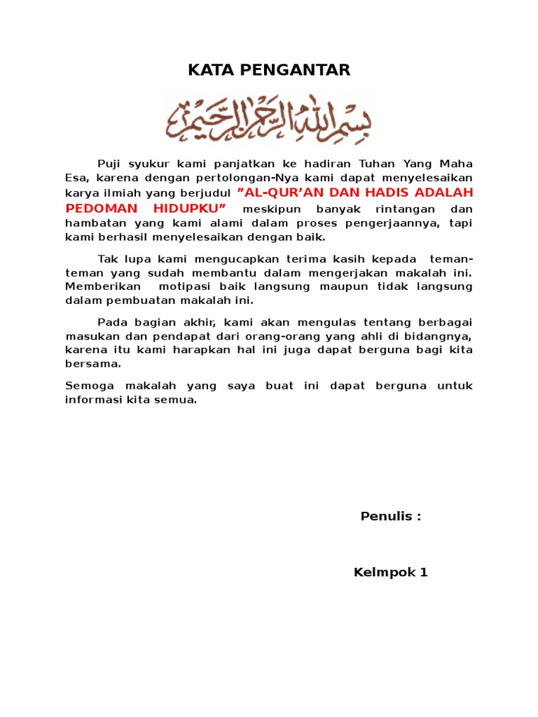 MAKALAH AL-ISLAM KEMUHAMMADIYAHAN AL-QURAN SEBAGAI PEDOMAN HIDUP DISUSUN OLEH. Umat islam percaya bahwa Al-Quran merupakan puncak dan penutup Wahyu Allah yang diperuntukkan bagi manusia dan bagian dari rukun iman yang disampaikan kepada Nabi Muhammad SAW melalui perantara Malaikat Jibril. Bahkan sebagian diantara mereka menyatakan bahwa surah Al-Qadr turun setelah Nabi Muhammad saw.
