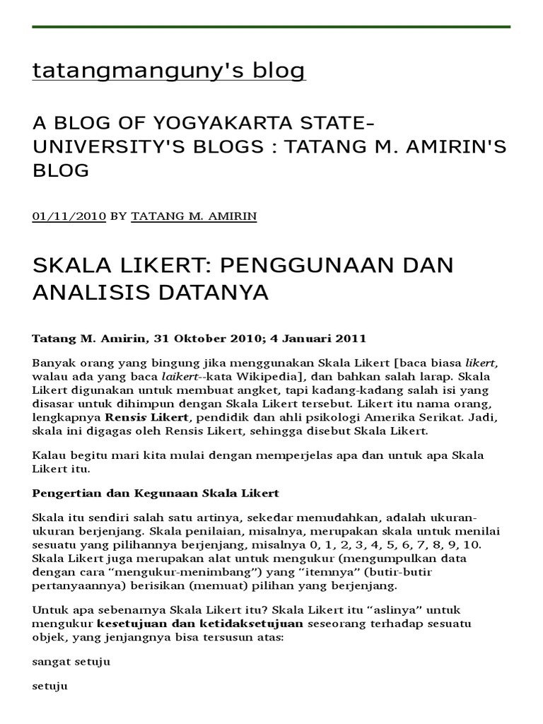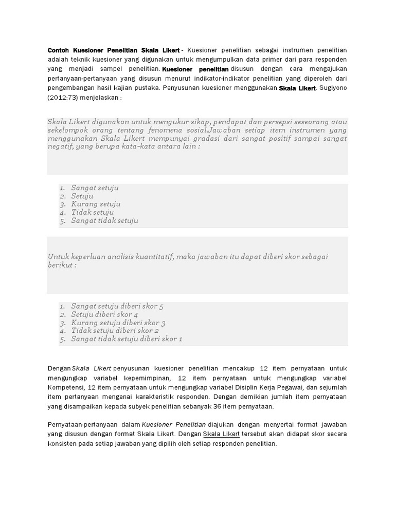 4 Januari 2011 Banyak orang yang bingung jika menggunakan Skala Likert baca biasa likert walau ada yang baca laikert--kata Wikipedia dan bahkan salah larap. Jawaban setiap item instrumen yang menggunakan Skala Likert mempunyai gradasi dari sangat positif sampai sangat negatif. Kuesioner skala likert scribd com.