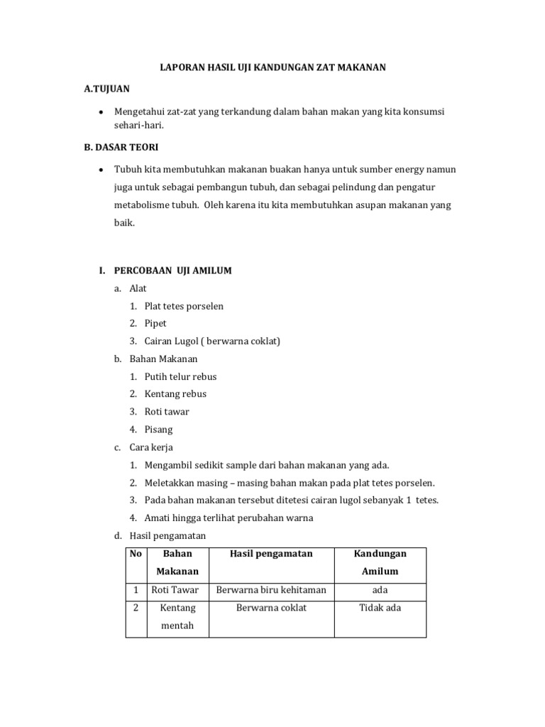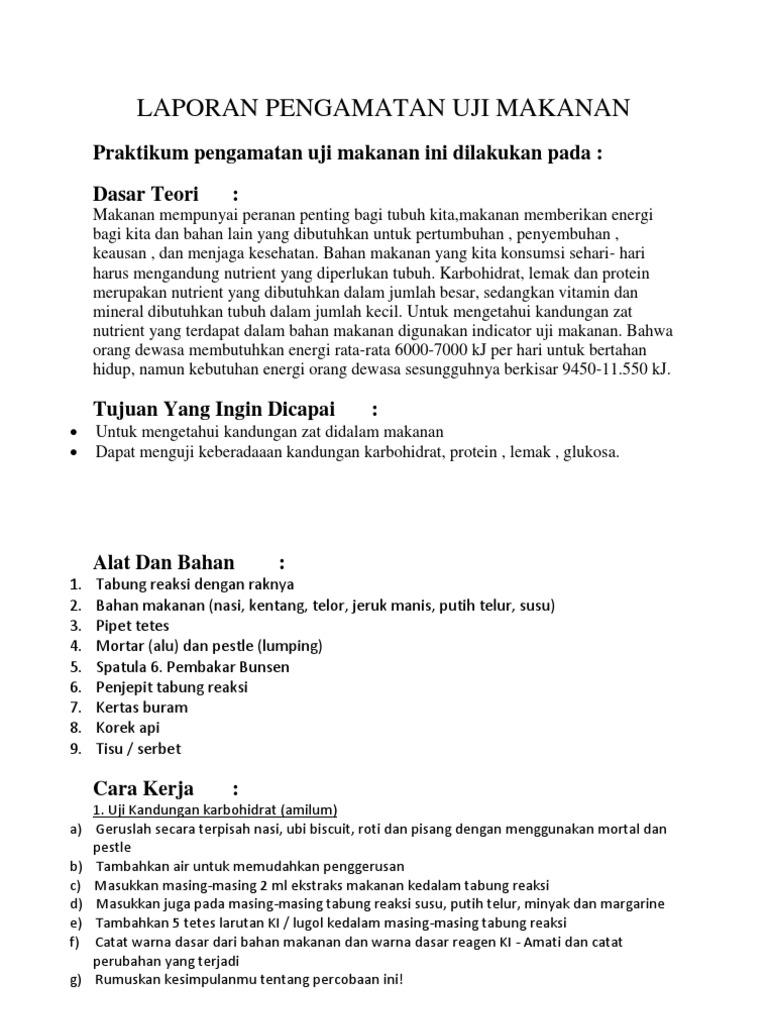 LAPORAN PRAKTIKUM BIOLOGI SEMESTER GENAP TAHUN PELAJARAN 20102011 UJI MAKANAN Disusun oleh. Contoh Laporan Praktikum Biologi Uji Kandungan Bahan Makanan By Dosso Sang IsahiPosted on 13 July 2015 Artikel ini telah dibaca 185016 kali. Karbohirat terdiri dari dua jenis yaitu karbohirat sederhana yang terkandung dalam nasi jagung singkong dan lain lain.