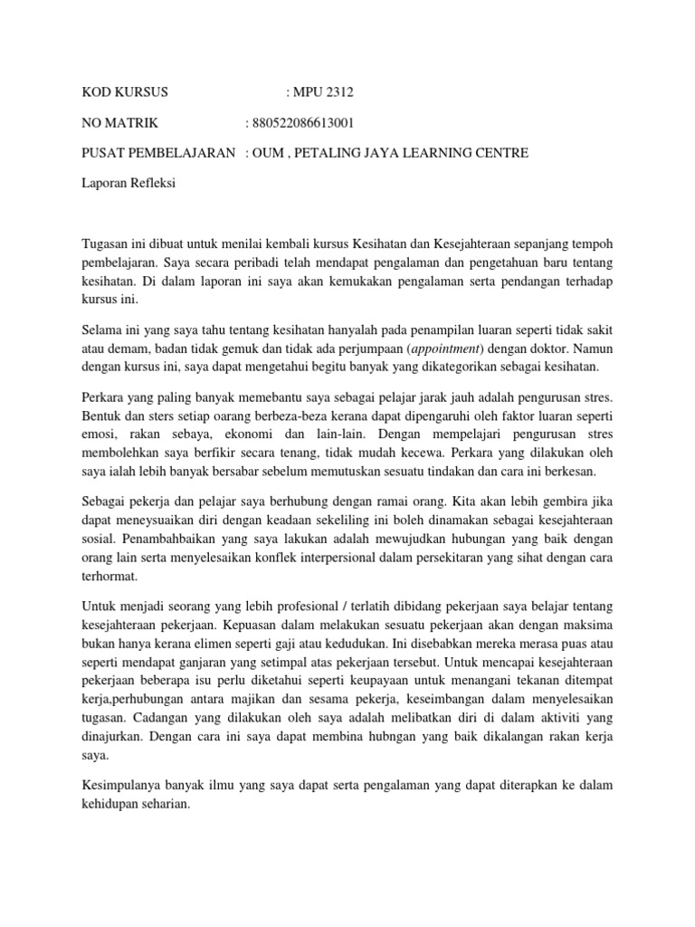 Laporan Refleksi Kesihatan Dan Kesejahteraan Mpu 2312 Oum