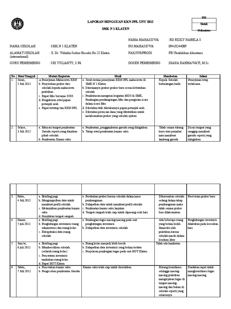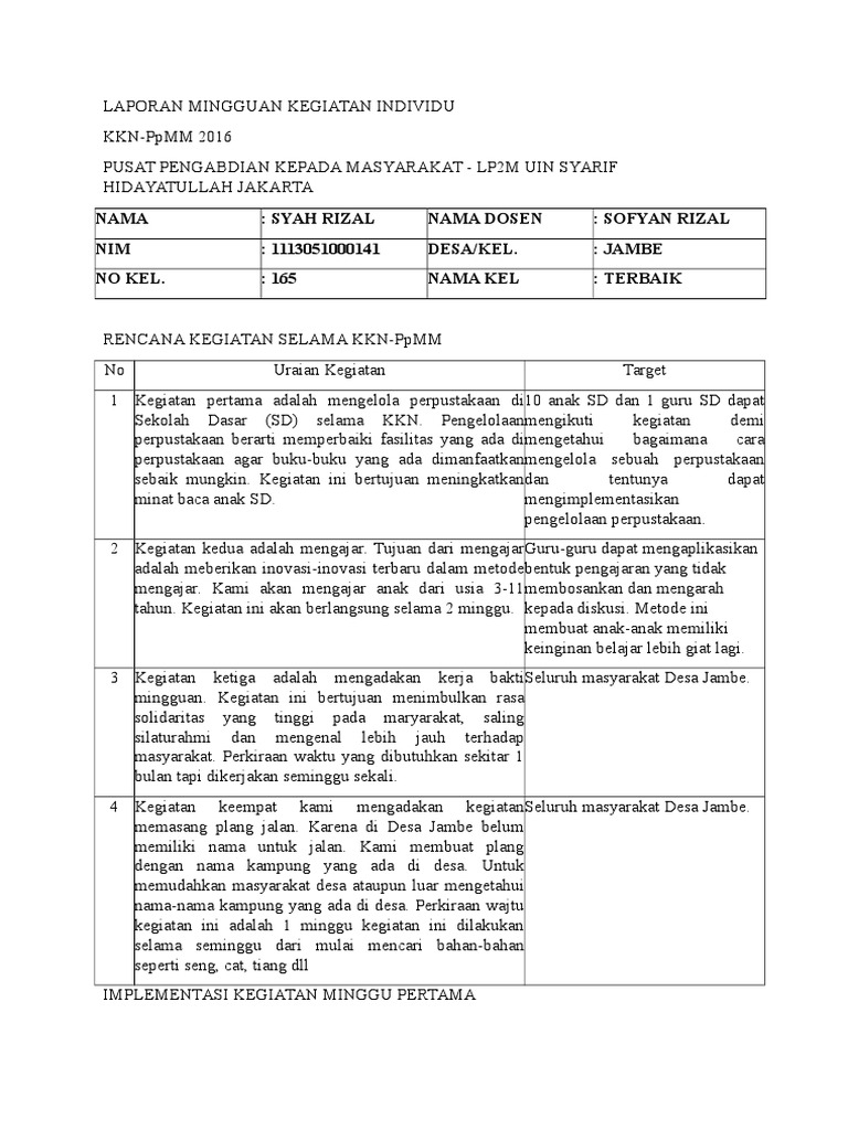 Contoh format laporan mingguan kkn. CONTOH LAPORAN INDIVIDU KKN LAPORAN INDIVIDU. Contoh jadwal kegiatan laporan magang contoh jadwal kegiatan laporan pkl contoh laporan jadwal kegiatan Download contoh jadwal kegiatan format excel disini baca juga. 7 Contoh Daftar Program Kerja KKN Terbaru Dan Lengkap.