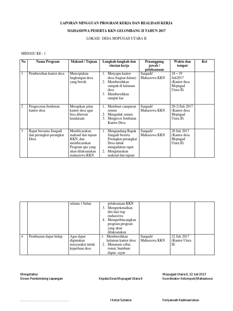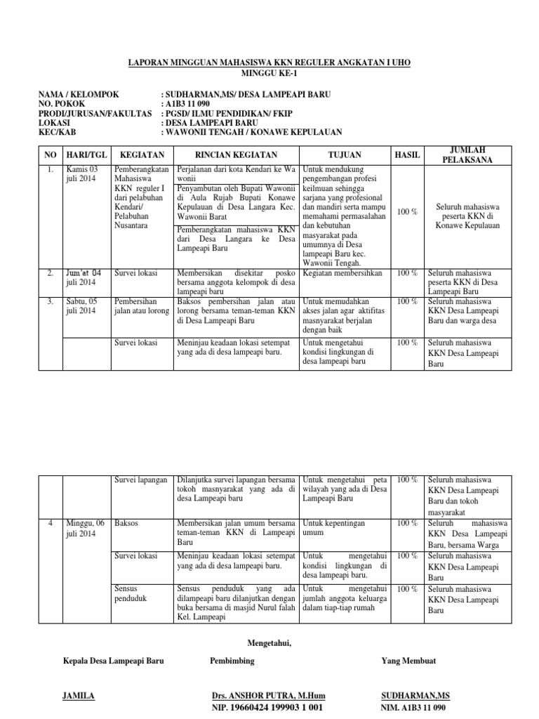 Contoh laporan kkn mingguan. Laporan kegiatan lomba ini kami buat dengan sebenar benarnya jika masih terdapat banyak kesalahan pada laporan ini akan kami perbaiki lagi di kegiatan selanjutnya. Laporan kuliah kerja nyata K KN di Desa Purwasaba Kecamatan Mandiraja Kabupaten Banjarnegara dengan lancar dan baik.