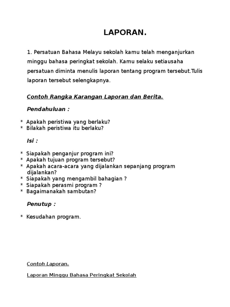 Contoh karangan upsr laporan minggu bahasa melayu. Salin semula contoh karangan Laporan di bawah. Bagi calon yang akan menduduki peperiksaan Sijil Pelajaran Malaysia SPM anda dikehendaki menjawab soalan penulisan karangan Bahasa Melayu pada Bahagian A dan Bahagian B Kertas 1. Bahagian A merupakan karangan yang.
