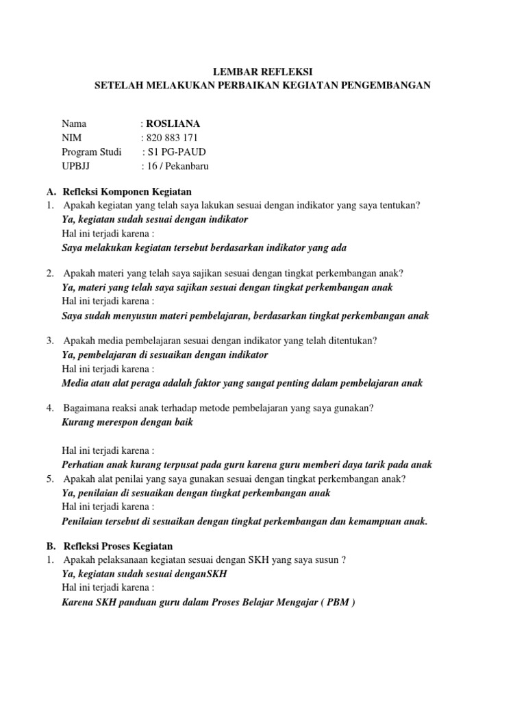 Doc Lembar Refleksi Setelah Melakukan Pembelajaran Program Studi S1 Pgsd Upbjj Batam Anton Suyanto Academia Edu