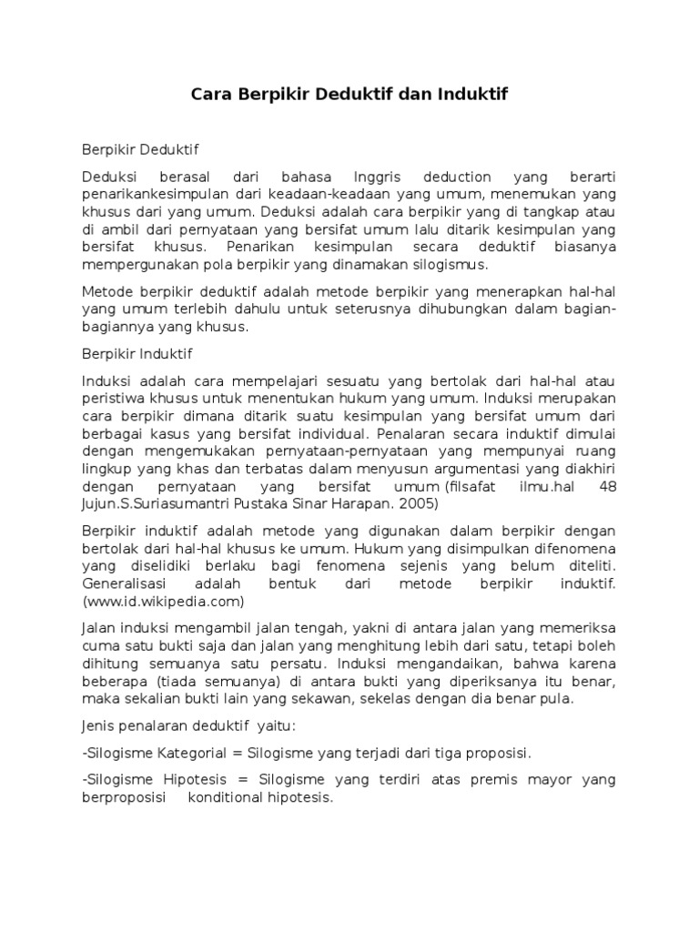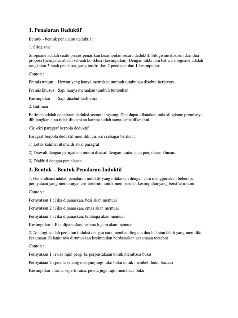 Dengan kata lain kita menarik kesimpulan berupa fakta umum berdasarkan gagasan-gagasan khusus yang telah dijabarkan sebelumnya. Pengertian Deduktif Penalaran deduktif adalah sebuah proses penalaran untuk menarik kesimpulan berupa prinsip atau sikap yang berlaku khusus berdasarkan atas. Penalaran induktif adalah pemikiran tentang sebuah penarikan kesimpulan yang bersifat.